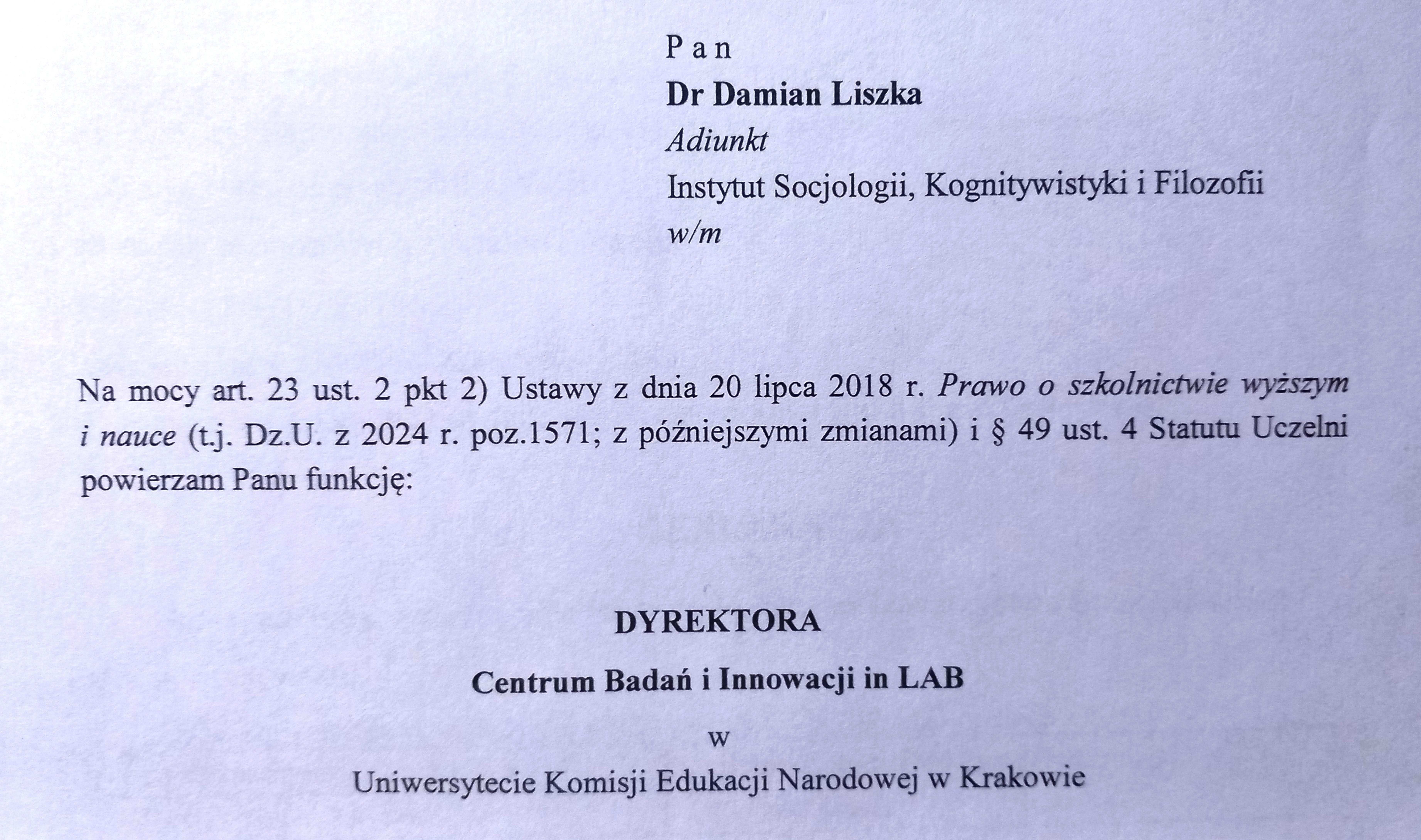 Na zdjęciu widoczny jest fragment dokumentu dotyczącego powołania dra Damiana Liszki z Instytutu Socjologii, Kognitywistyki i Filozofii na funkcję Dyrektora Centrum Badań i Innowacji „In-Lab” w UKEN